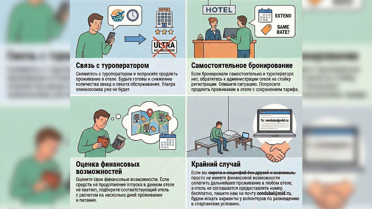 Россиян призвали трезво оценивать свои финансовые возможности при планировании дальнейшего пребывания на отдыхе, а также быть готовыми самостоятельно оплачивать проживание. Одним из вариантов выхода из ситуации может стать переезд в более бюджетный отель, советуют дипломаты.