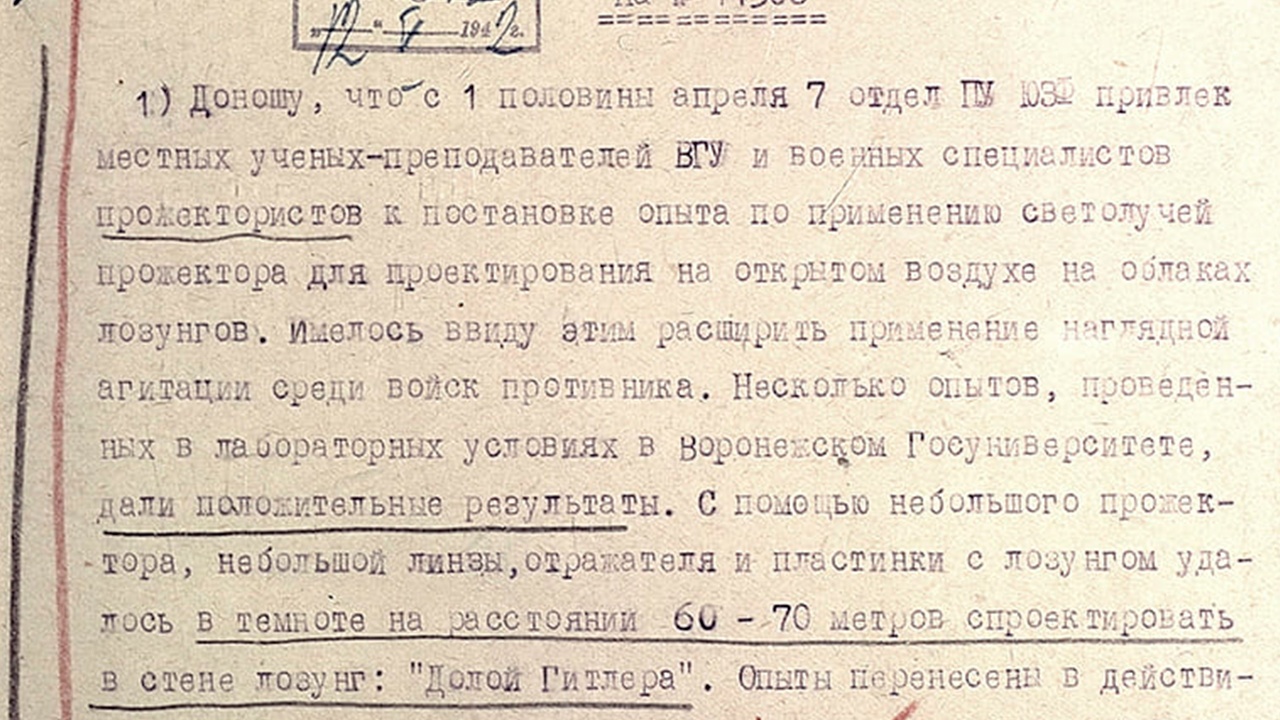 В донесении политуправления Юго-Западного фронта от 29 апреля 1942 года сохранилась информация об этом эксперименте. Для участия в нем 7-й отдел политуправления привлек ученых-преподавателей ВГУ и военных специалистов-прожектористов. Суть опыта заключалась в применении светолучей прожектора для проектирования лозунгов прямо на облаках. Ряд экспериментов, проведенных в лабораторных условиях в Воронежском госуниверситете, дал положительные результаты.